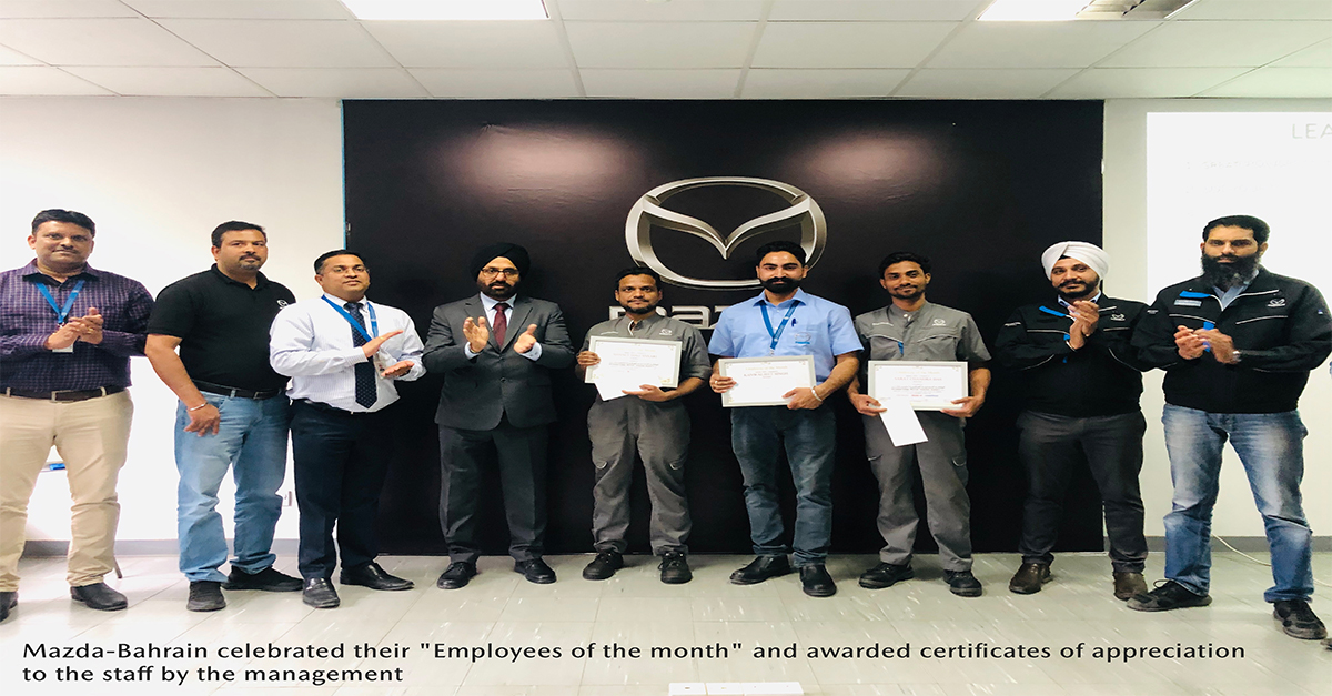 تقديم الشهادات التقديرية للفريق الفني مع السيد سيمر بال (مدير قسم الصباغة والسمكرة) الأول من اليسار، السيد ريموند (مدير الموارد البشرية) السابع من اليسار، السيد ك.ن.سينغ (نائب الرئيس التنفيذي ) الثامن من اليسار، السيد سومان م. سمانة (المدرب) التاسع من اليسار، و السيد سونيل كومار (مدير الخدمات) السادس من اليمين. "احتفلت مازدا البحرين بنجاح إكمال شهادة "Mazda master certificate level 1" لموظفيها المؤهلين. و كعربون للتقدير، تم منح الموظفين المؤهلين شهادة بحضور الإدارة العليا لـ IMTA (الوكالة الدولية لتجارة السيارات) السيد ك.ن. سينغ (نائب الرئيس) والسيد سونيل كومال (مدير الخدمات).